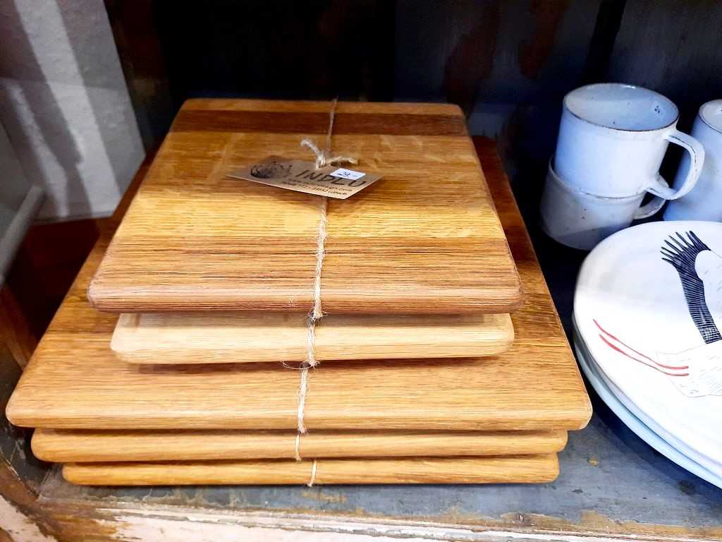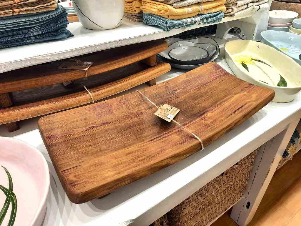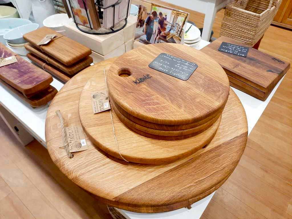 Servier-und Schneidebretter, Schalen, Kleinmöbel und mehr aus dem Eichenholz alter Weinfässer. Auch gleiche Teile sehen unterschiedlich aus durch die Verfärbungen vom Rotwein, Holzmaserungen und helle und dunkle Weinfassdauben. Einige Produkte werden aus den Fassdeckeln gefertigt und aus Eichenholzstäben. Im Laden haben wir eine große Auswahl.