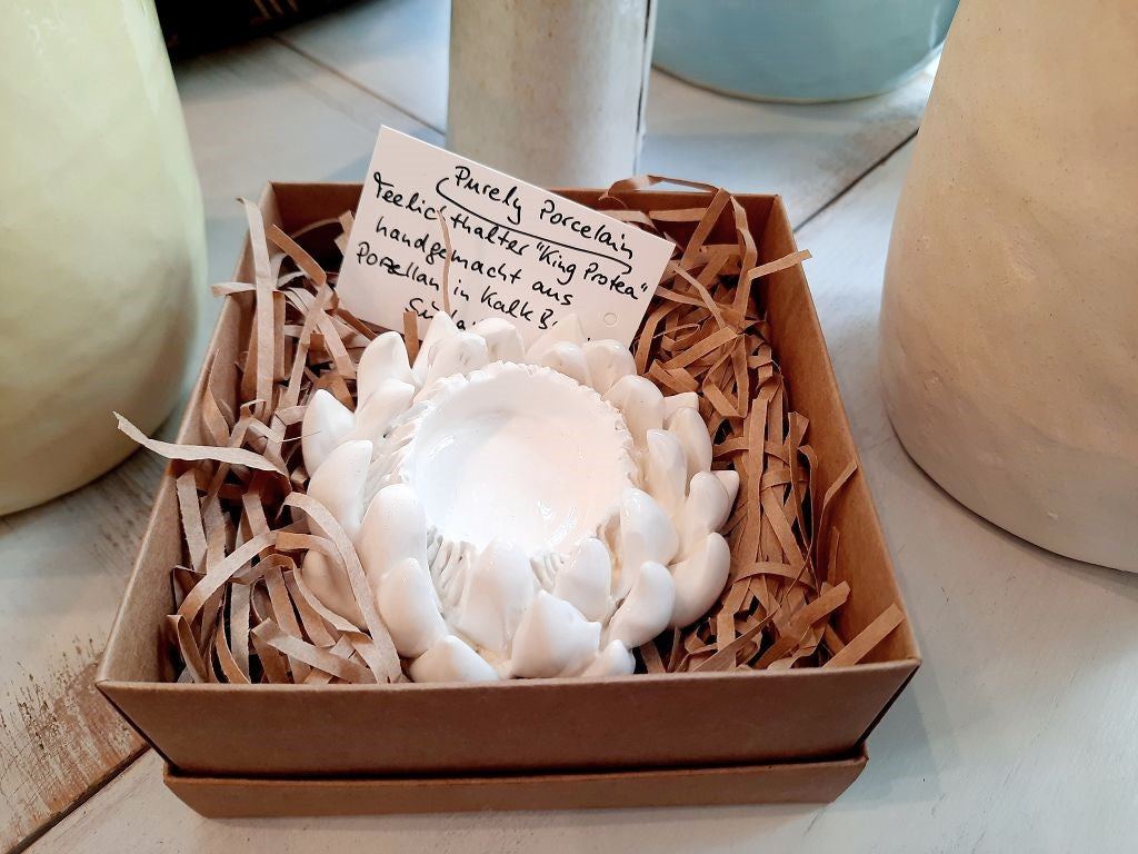 Von PURELY PORCELAIN aus Kalk Bay, Südafrika gleicht kein Stück haargenau dem anderen und somit ist es für mich fast unmöglich, die schönen handgemachten Produkte in den Onlineshop einzustellen. Im Sortiment haben wir die beliebten Vögel und Blumen mit Holzstäben, Ohrringe, Ohrstecker und Halsketten mit Anhänger, kleine Schälchen als Schmuckablage oder für Kleinigkeiten und die Königsprotea als Tischdeko. Bitte kontaktiere mich bei Interesse. Dann finden wir eine Lösung.